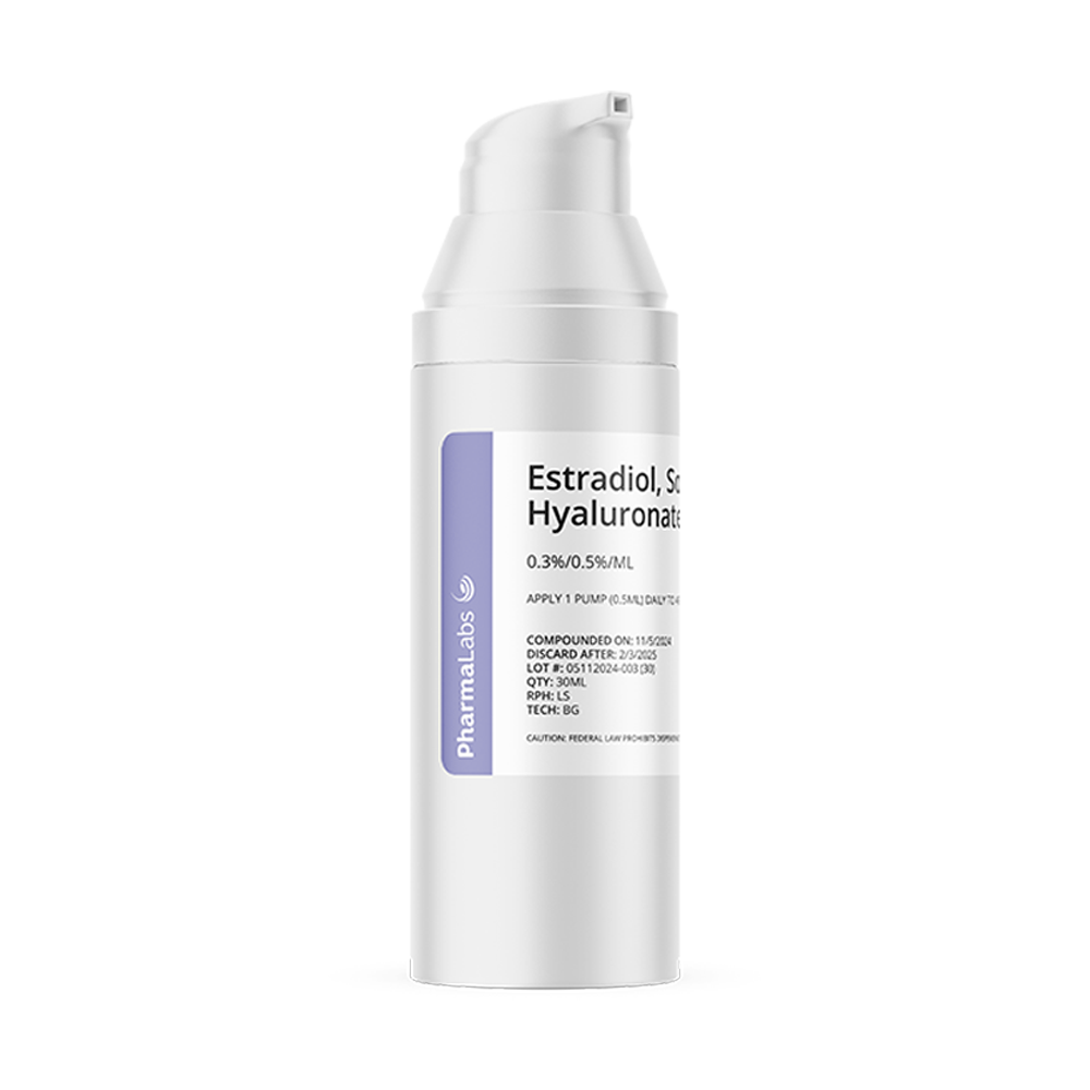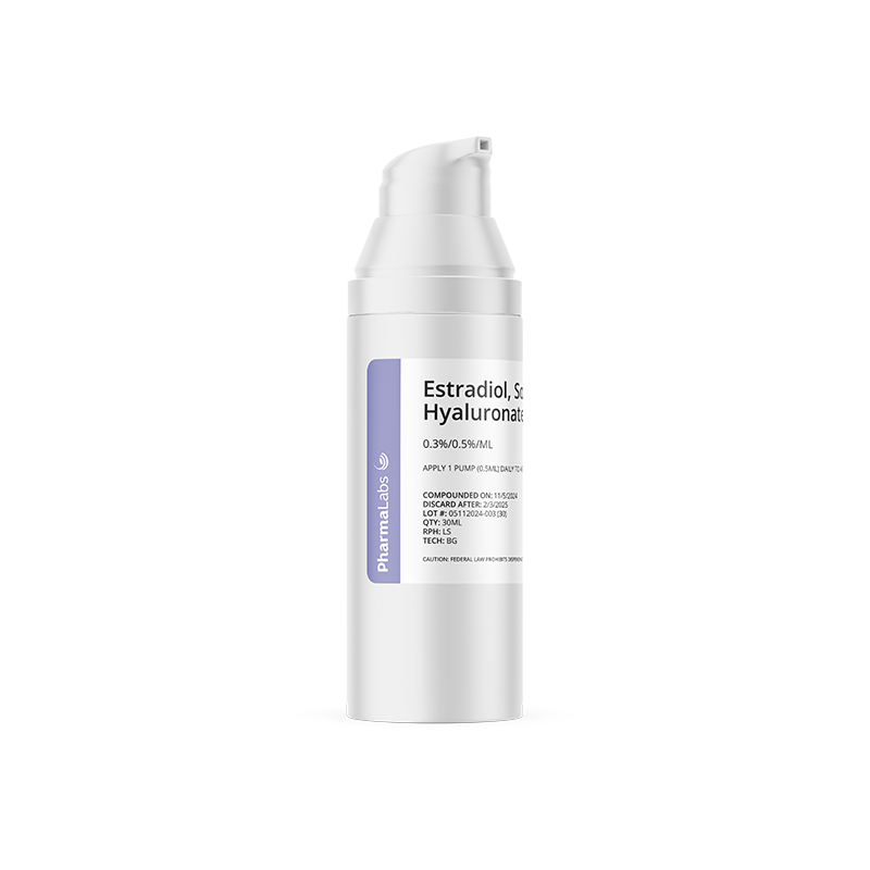This compounded facial cream combines estriol, a gentle estrogen, with sodium hyaluronate, a hydrating agent, to support skin moisture, texture, and elasticity. It’s often considered for mature or hormone-affected skin.