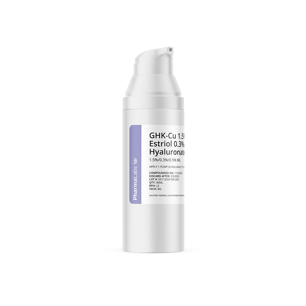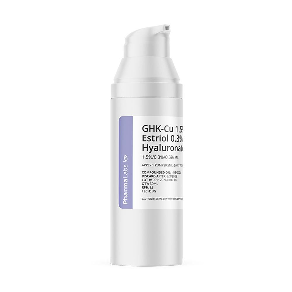 This compounded facial cream combines GHK-Cu (a copper peptide), estriol (a gentle estrogen), and sodium hyaluronate to support healthy skin hydration and texture. Often selected for mature or hormonally impacted skin.