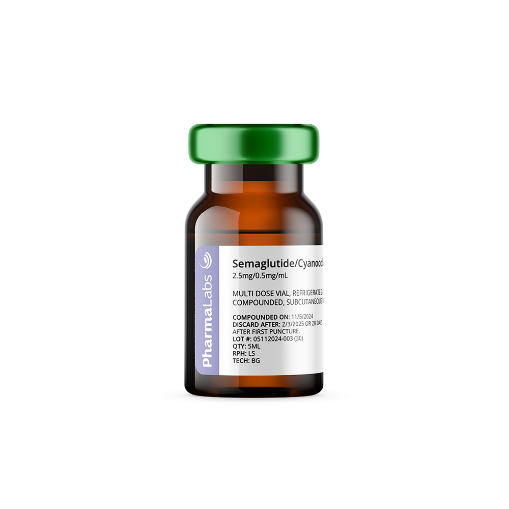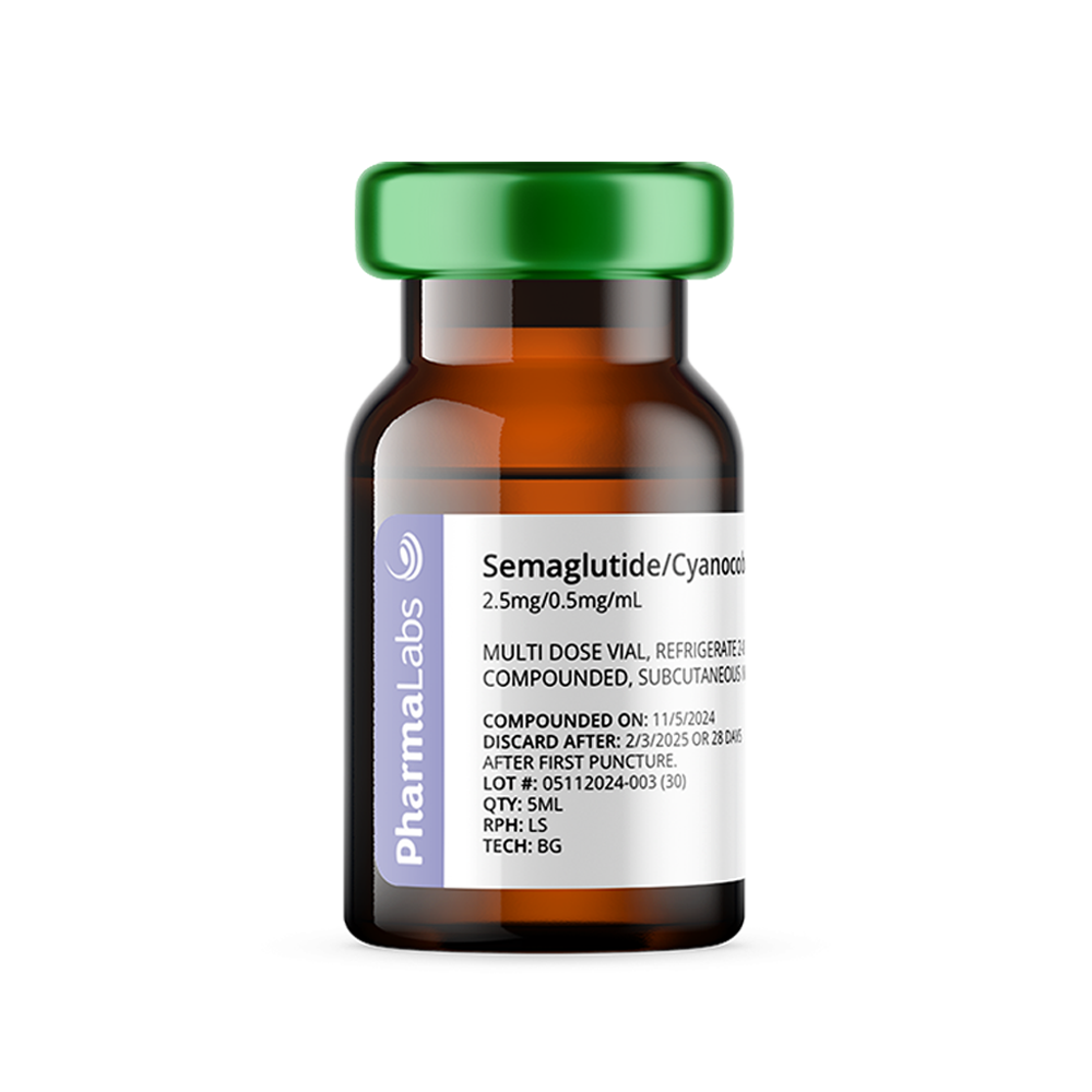 This injectable combines semaglutide, a GLP-1 receptor agonist that promotes weight loss and blood sugar control, with cyanocobalamin (vitamin B12), which supports energy, metabolism, and nerve function—ideal for patients focused on weight and metabolic health.