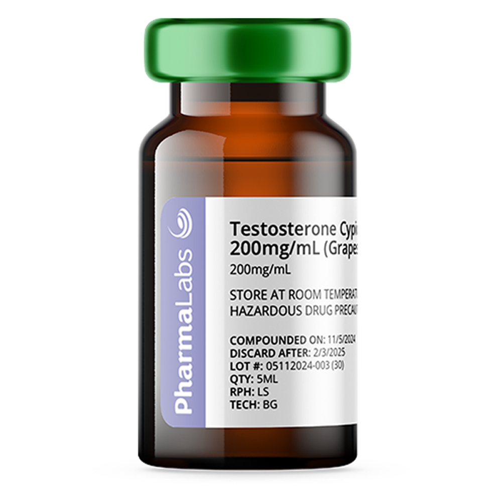 Testosterone Cypionate Injection in Grapeseed Oil is a compounded medication prepared by PharmaLabs. It is designed to support individualized hormone therapy by allowing providers to tailor dosing, concentration, and volume to each patient’s needs.