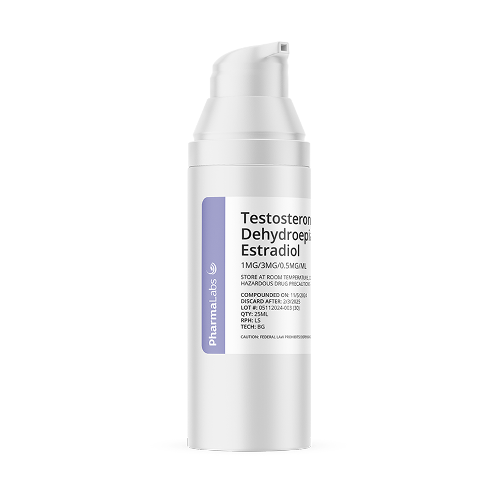 This compounded vaginal cream combines bioidentical estradiol, DHEA, and testosterone to relieve menopause-related symptoms like dryness, irritation, and low libido. It restores hormone balance locally to support comfort, tissue health, and sexual function.