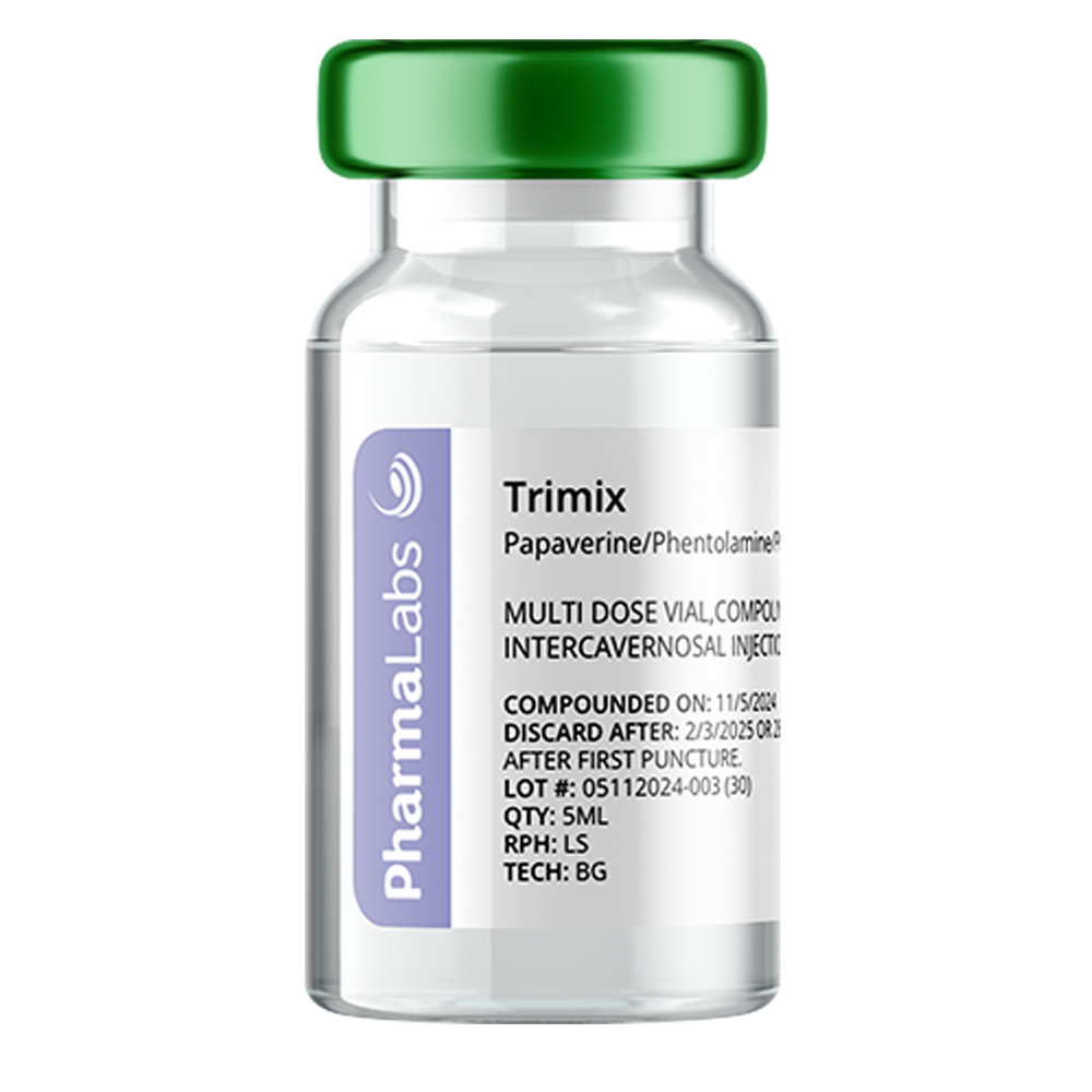 Trimix injections work by relaxing the corporal smooth musculature. This allows for increased blood flow to the penis to achieve and maintain an erection strong enough for the entirety of sexual intercourse. Trimix should be injected 5-15 minutes prior to sexual activity.